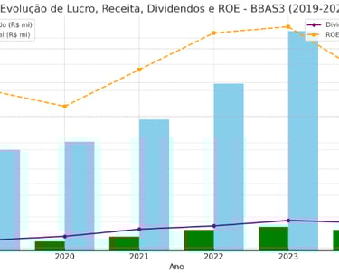 Comparação setorial: em relação aos concorrentes (ITUB4, BBDC4, SANB11), o BBAS3 se destaca pela rentabilidade e dividendos. No 3T24, o ROE do BB (21,1%) era próximo ao do Itaú (22,7%) e superior aos do Santander (17%) e Bradesco (12,4%). O dividend yield do BB (em torno de 13%) também é maior do que o de Itaú (na faixa de 6-7%) e Bradesco (8-9%). Em valuation, o P/L do BB (~5,3 vezes) está abaixo do de bancos privados, indicando potencial de valorização se os riscos forem gerenciados.