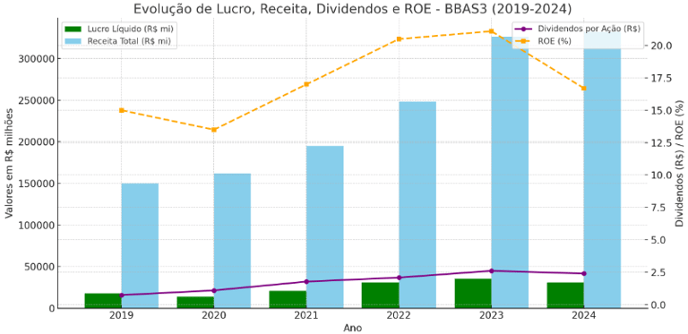 Crescimento de receita (5 anos): a receita total do BBAS3 tem crescido nos últimos anos. De 2019 a 2023, a receita líquida de juros e serviços subiu de aproximadamente R$150 bi para mais de R$326 bi. A taxa de crescimento composta (CAGR) da receita em 5 anos é de +18,0% ao ano. Isso inclui tanto a alta da receita financeira (por juros) quanto a de prestação de serviços (cresceu ~4,6% em 2023). Embora 2020 tenha sido atípico, o balanço geral mostra tendência de alta, cumprindo o critério de crescimento de receitas nos últimos 5 anos.